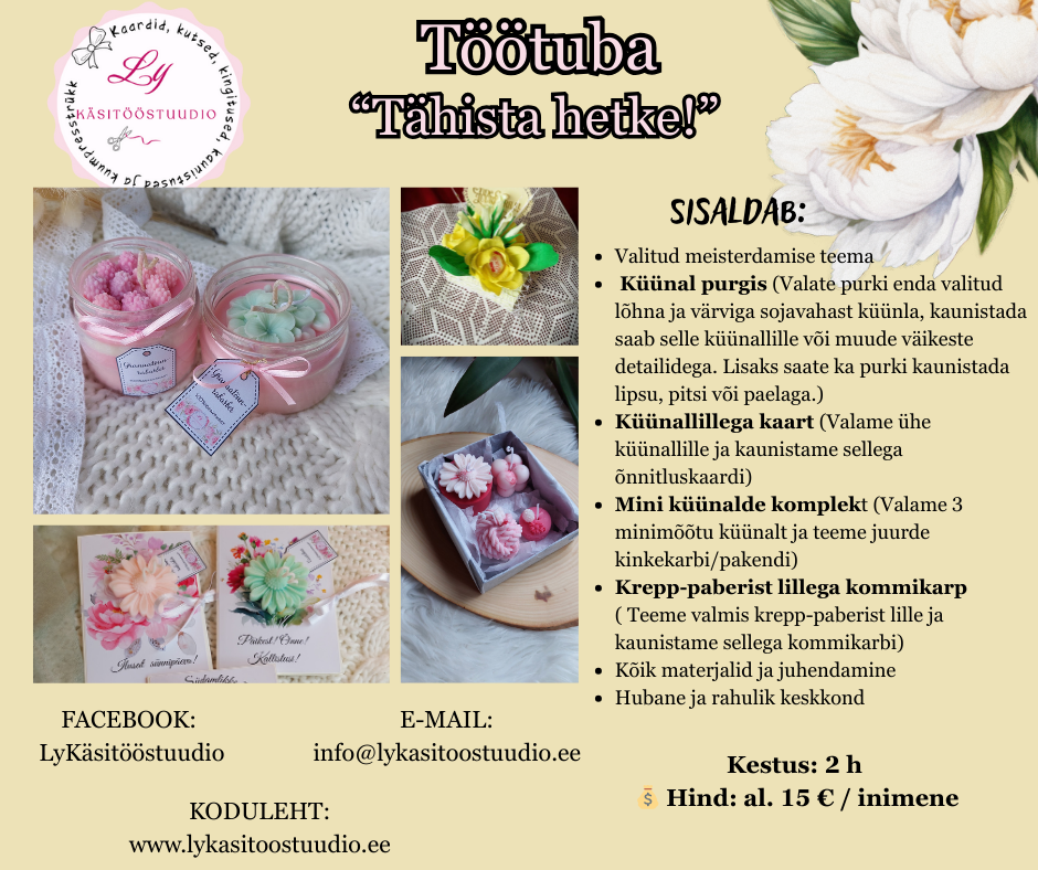 Siit leiad armastusega loodud personaalsed õnnitluskaardid, kaunid koogitopperid, erilised küünlad, nimelised dekoratsioonid ja palju muud, mis lisavad igale hetkele sära.