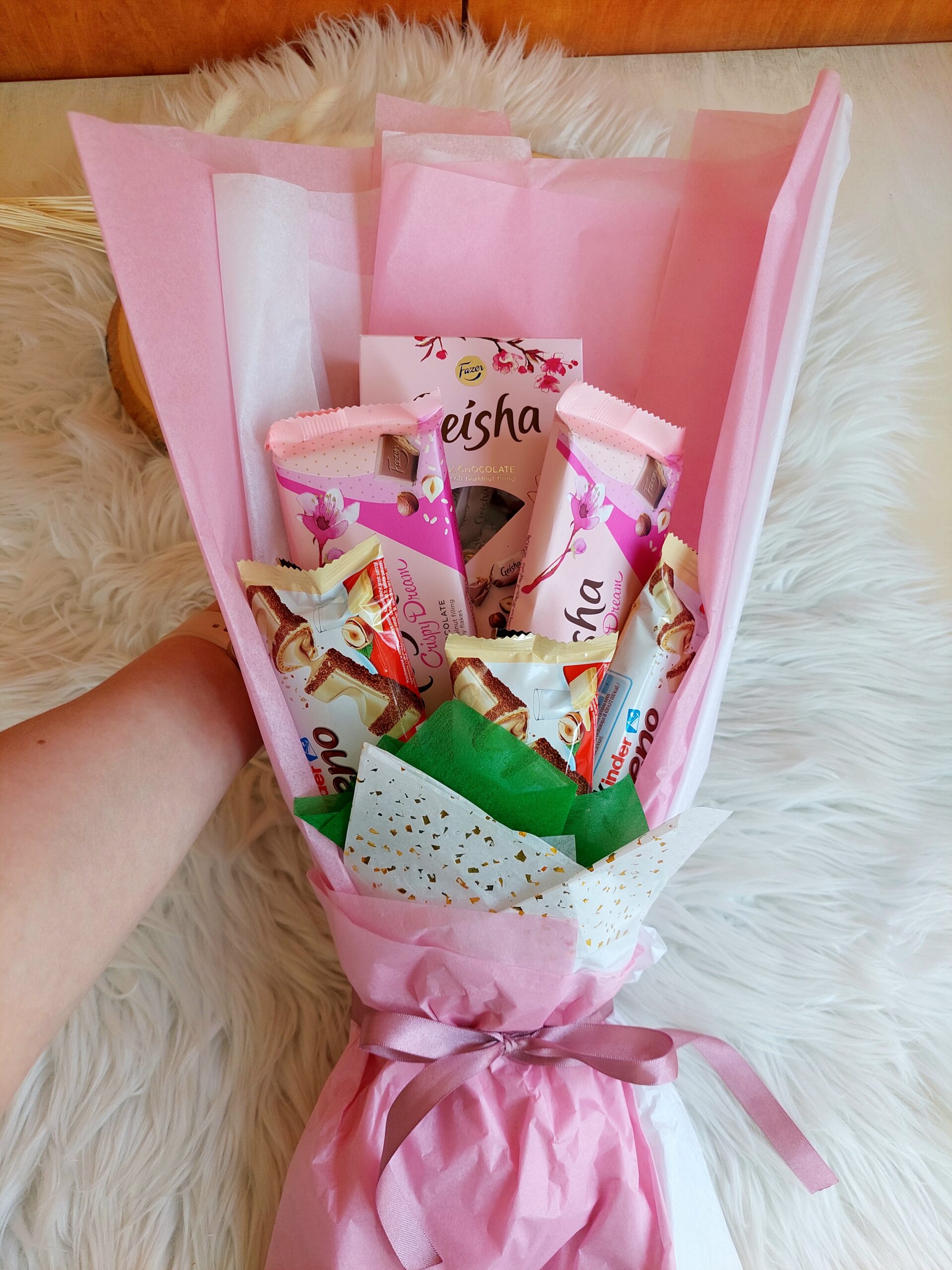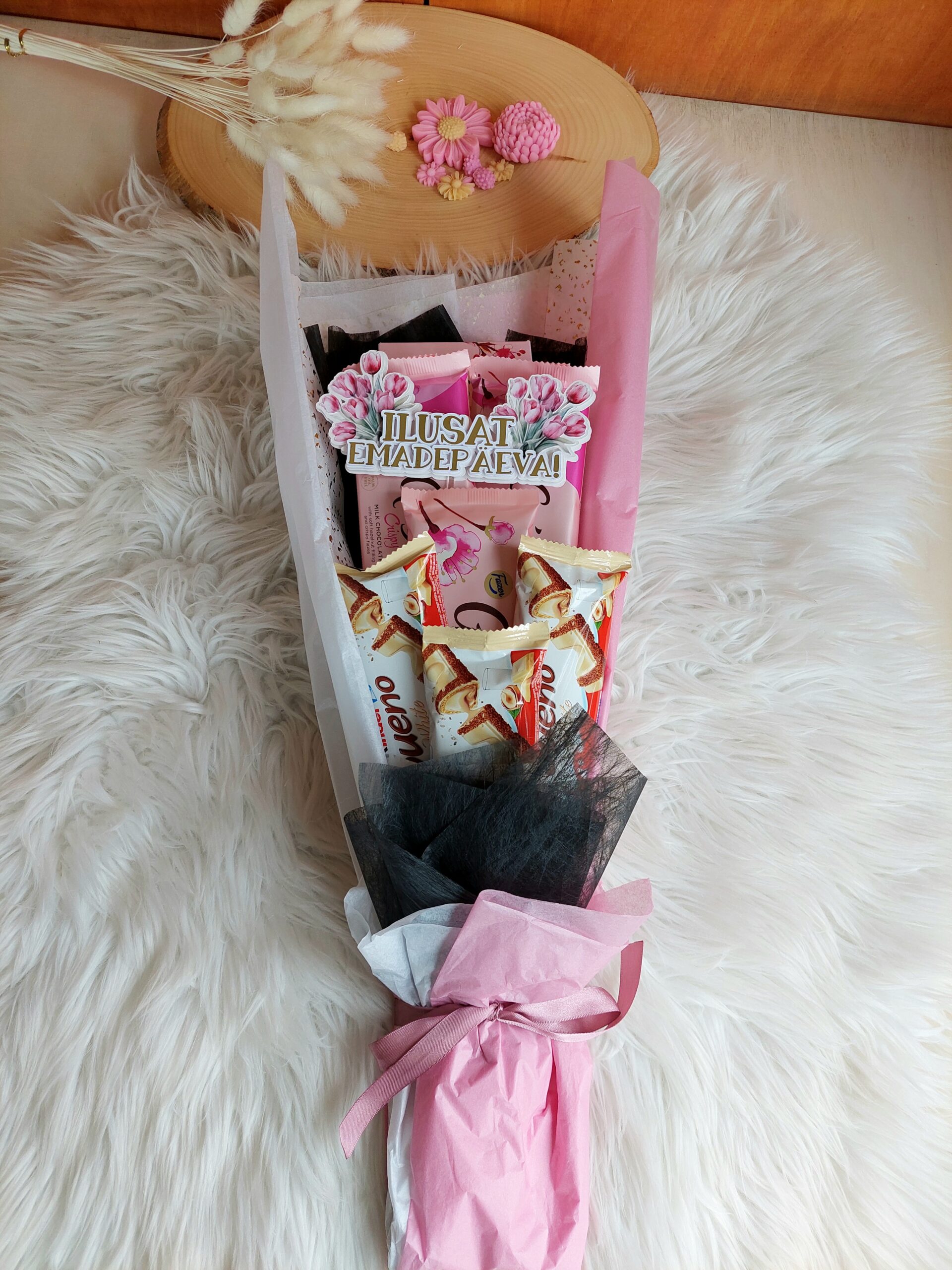 Elegantne ja maitsev maiustustekimp, mis sobib suurepäraselt kingituseks sünnipäevaks, tähtpäevaks või armsaks üllatuseks. Kimbus on ühendatud pehme karamellise täidisega Geisha šokolaad ja armastatud Kinder Bueno – kooslus, mis rõõmustab iga magusasõpra.