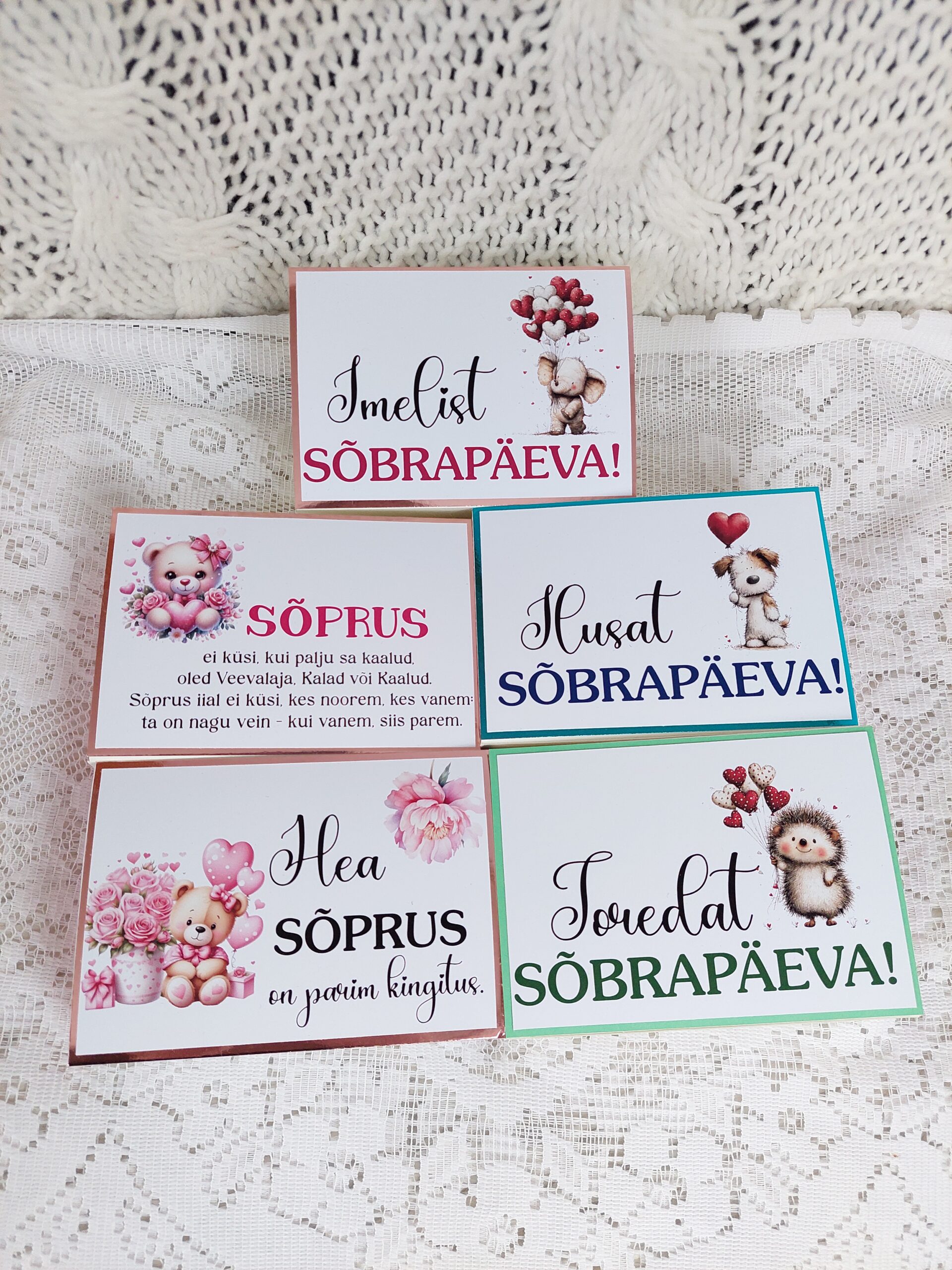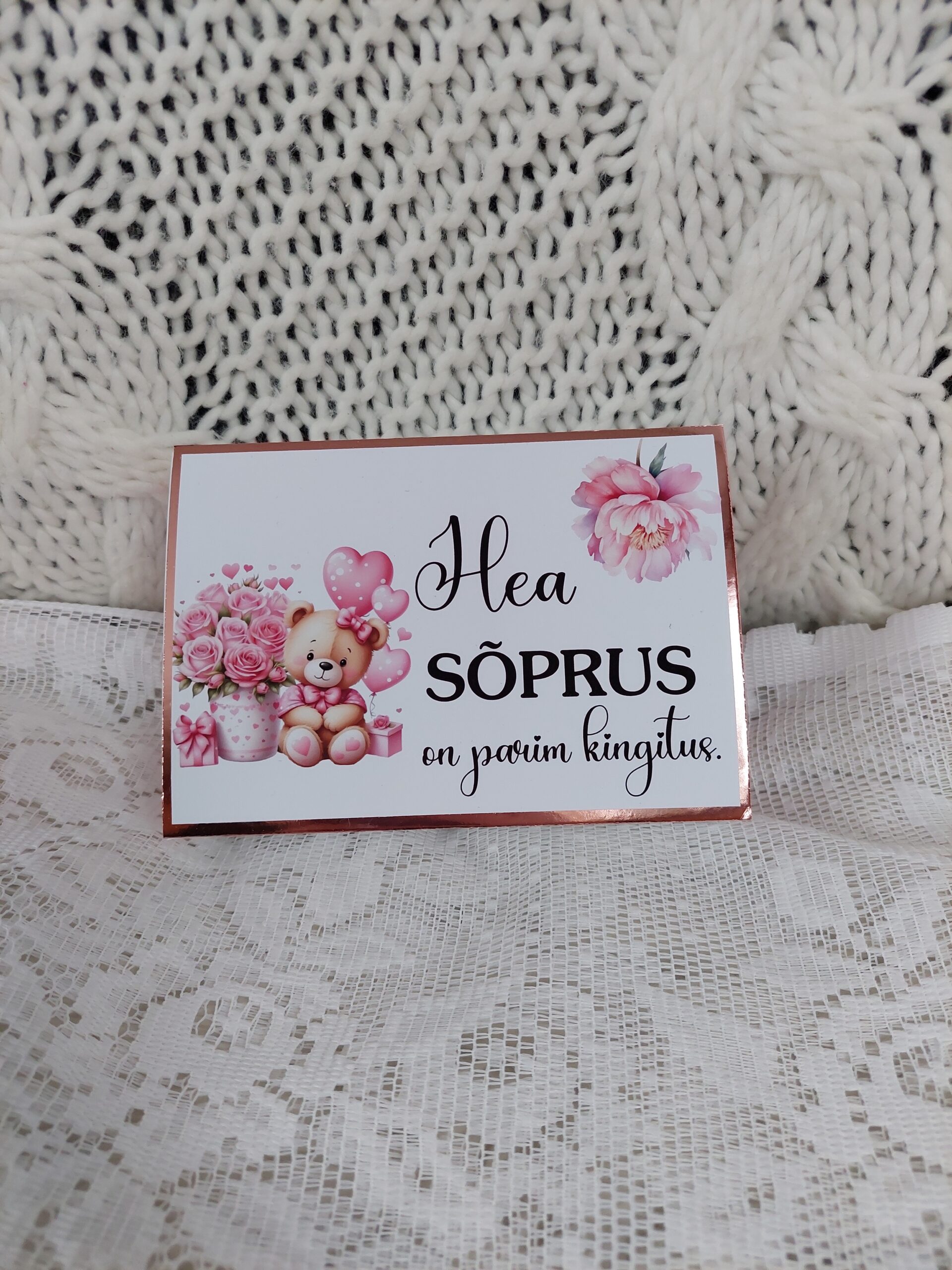 Iga ümbris valmib käsitööna ning selle disain on loodud just sõbrapäeva meeleolu silmas pidades — õrnad toonid, romantilised detailid ja soe sõnum loovad kingile täiusliku viimistluse.