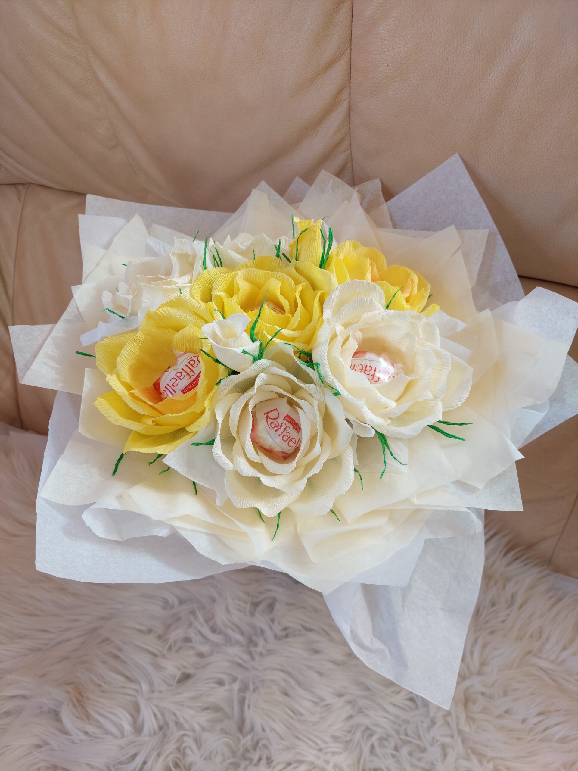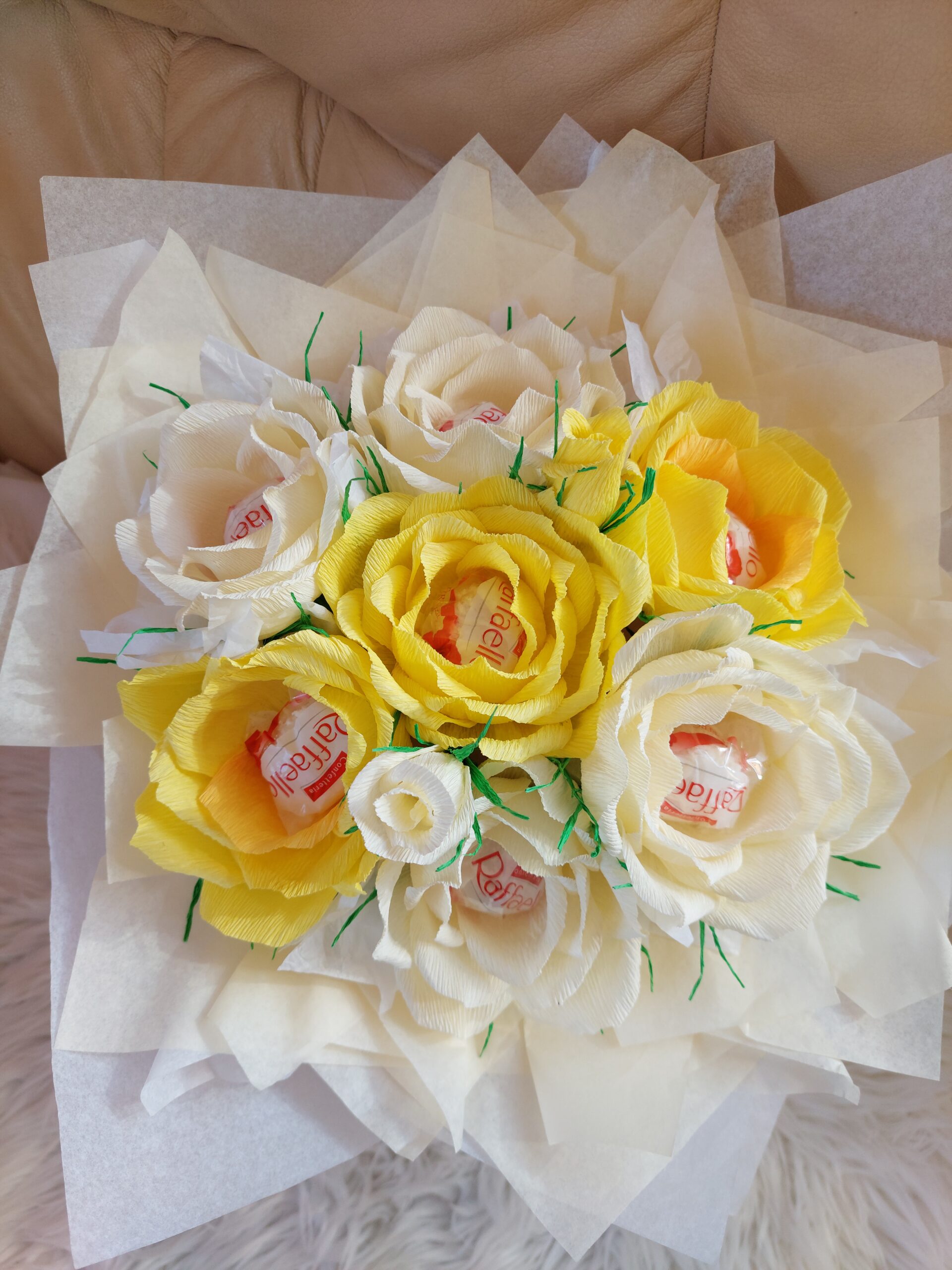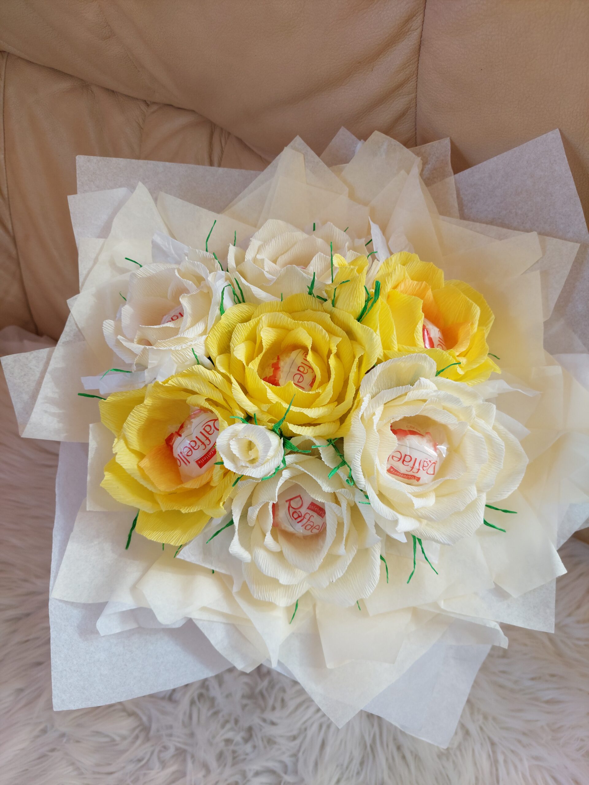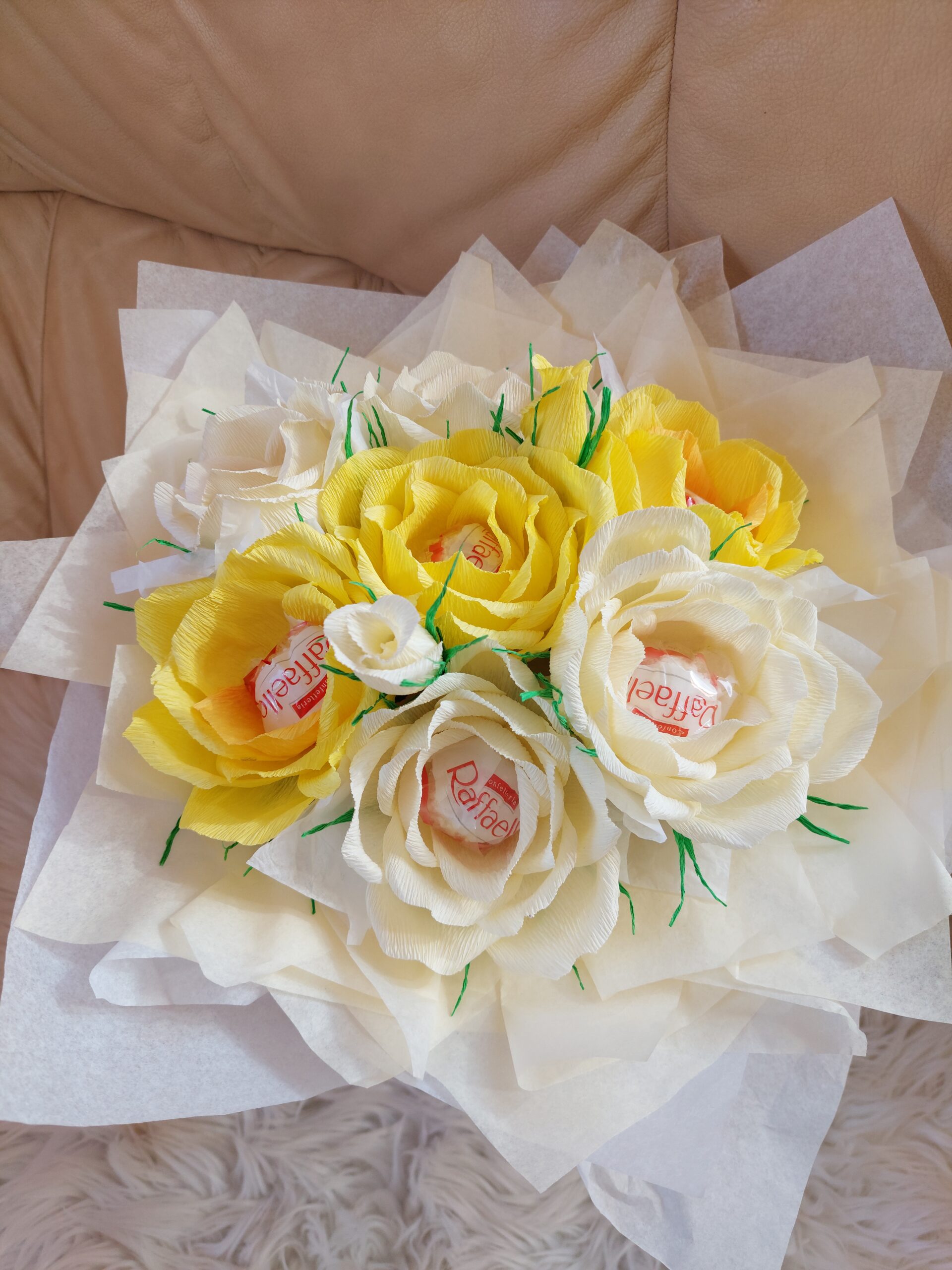 Kaunis kimp koosneb 7 lilleõiest, millest igaühe sees on Raffaello komm, luues täiusliku koosluse ilust ja maitsest. See on ideaalne kingitus sünnipäevaks, emadepäevaks või lihtsalt armsaks tähelepanuks, mis toob naeratuse igale saajale.