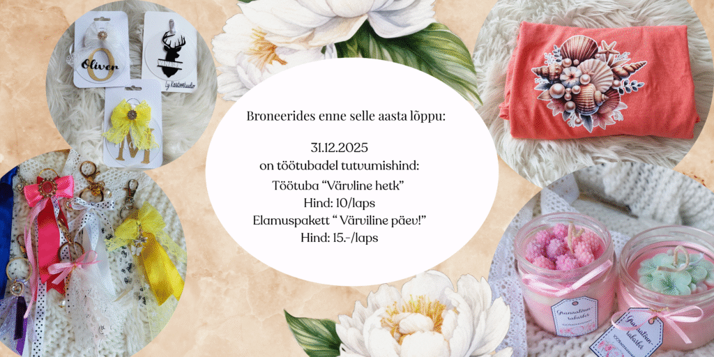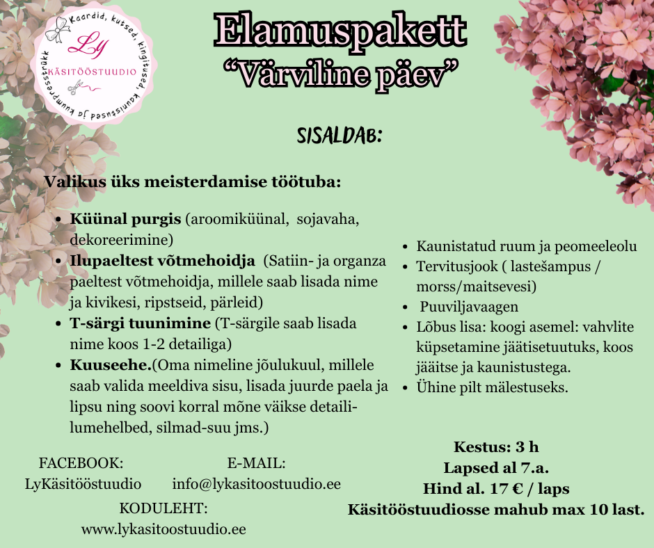 Tule ja veeda koos oma sõpradega lõbus ning loov aeg meie Käsitööstuudios! Töötuba on mõeldud lastele alates 7. eluaastast ja pakub võimalust meisterdada oma purgis küünla, võtmehoidjaid, kuuseehteid,t-särke. Kõik vajalikud materjalid on olemas, juhendaja loovab sõbraliku ja turvalise õhkkonna, kus iga laps saab avastada oma loovuse ja viia koju päris oma käsitööna valminud meistriteose.