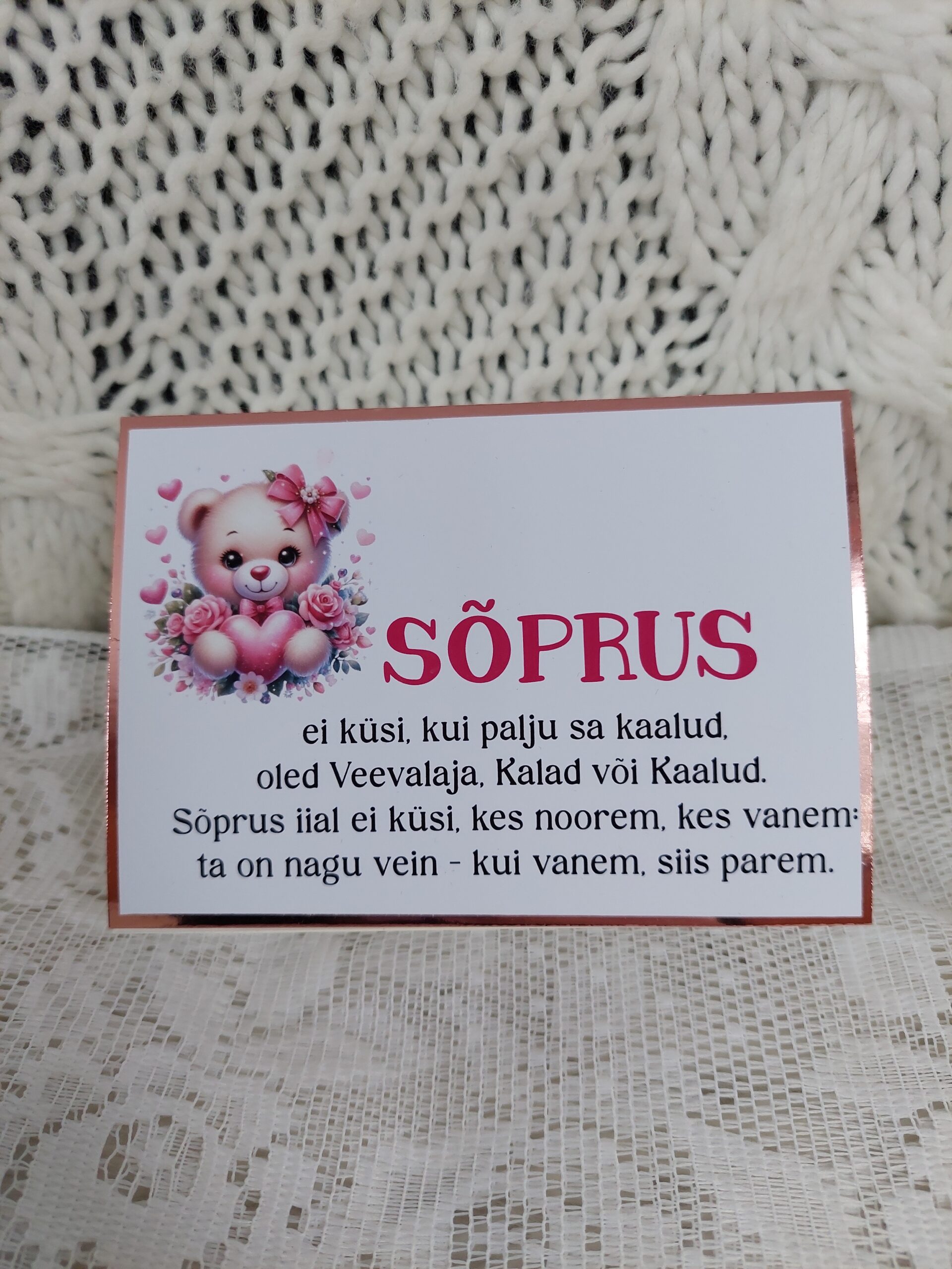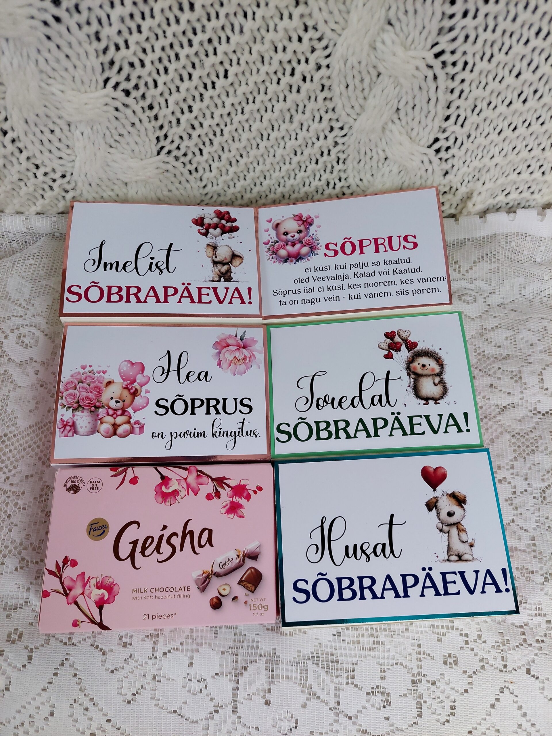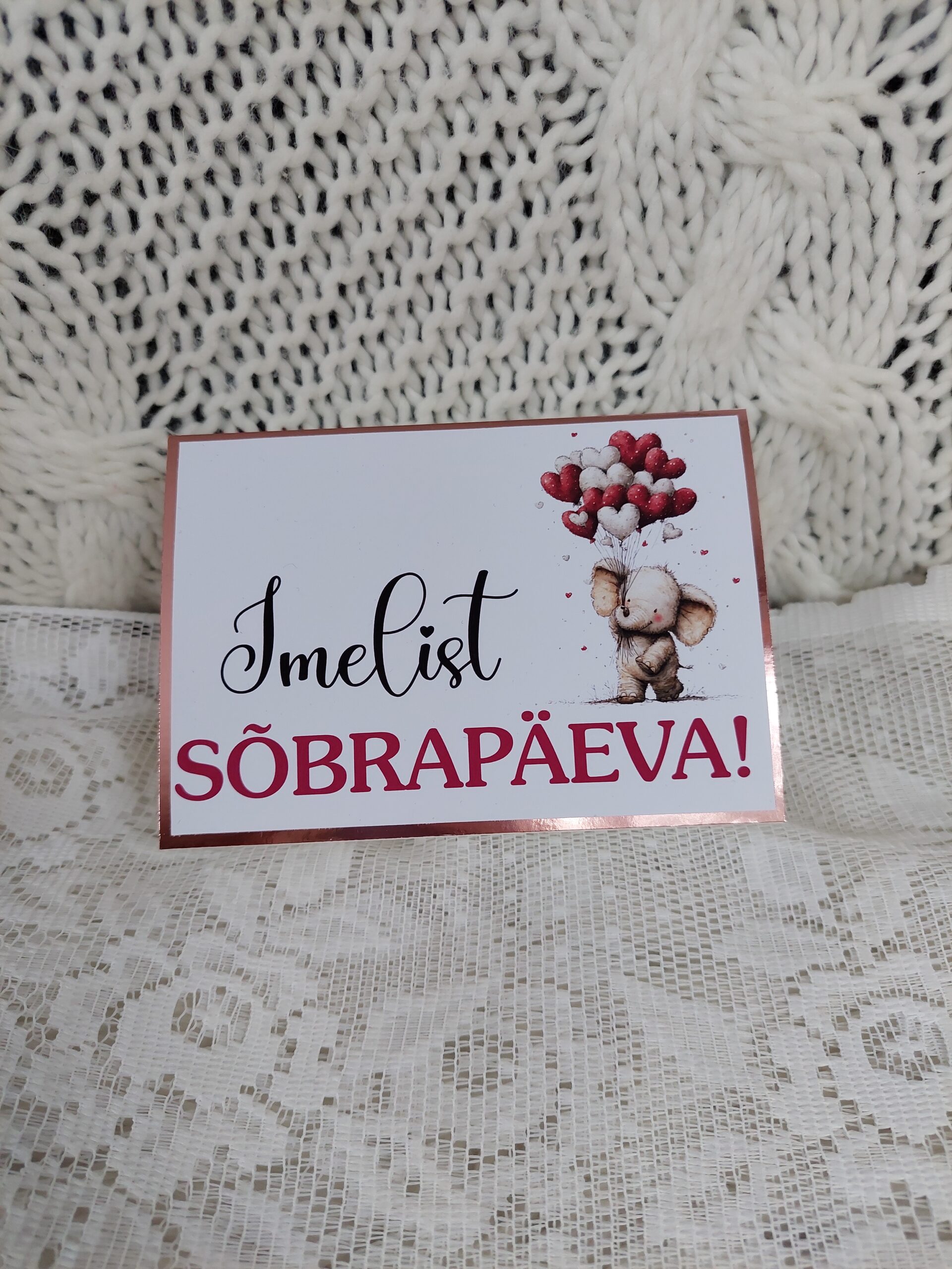 Iga ümbris valmib käsitööna ning selle disain on loodud just sõbrapäeva meeleolu silmas pidades — õrnad toonid, romantilised detailid ja soe sõnum loovad kingile täiusliku viimistluse.