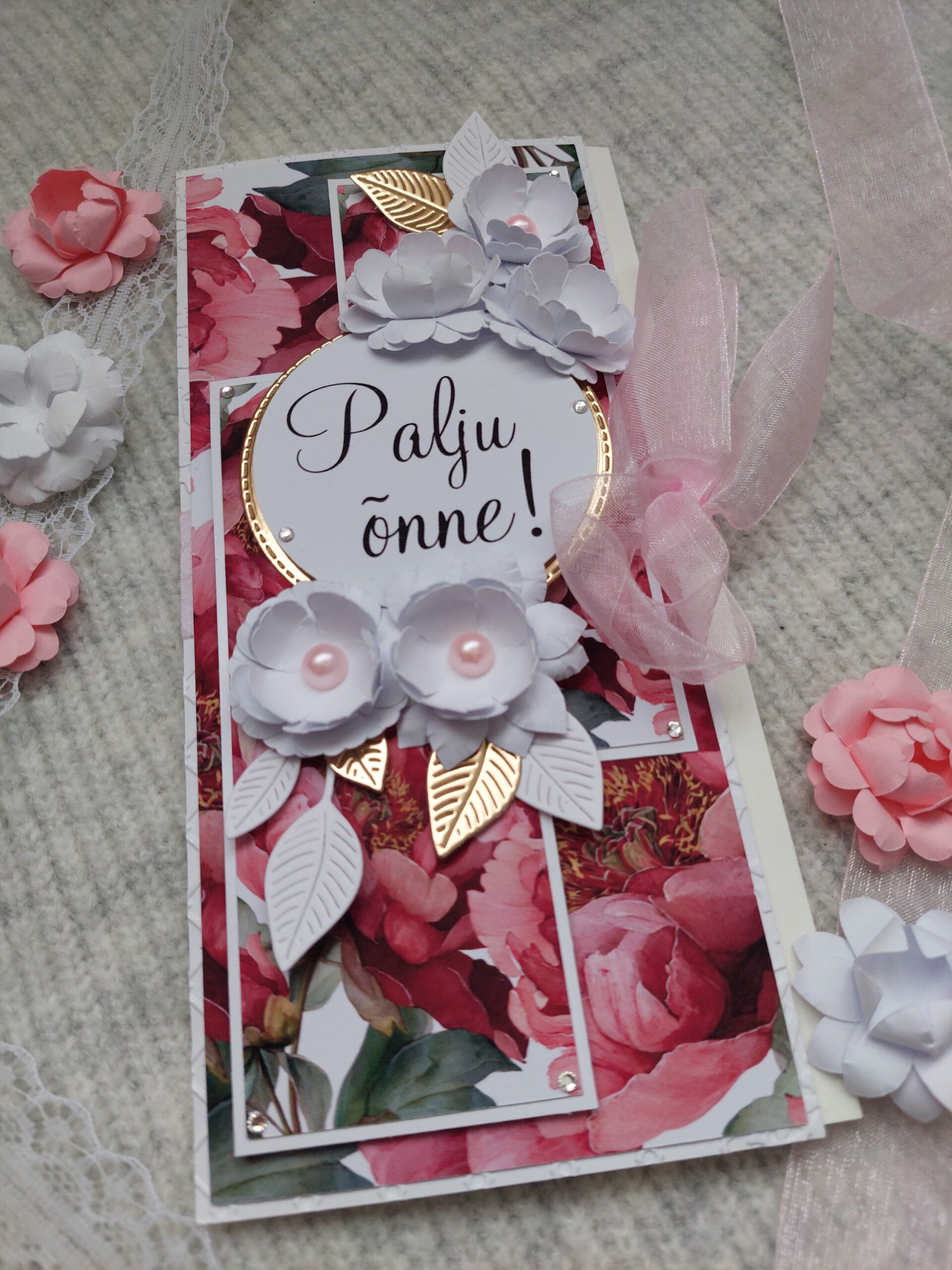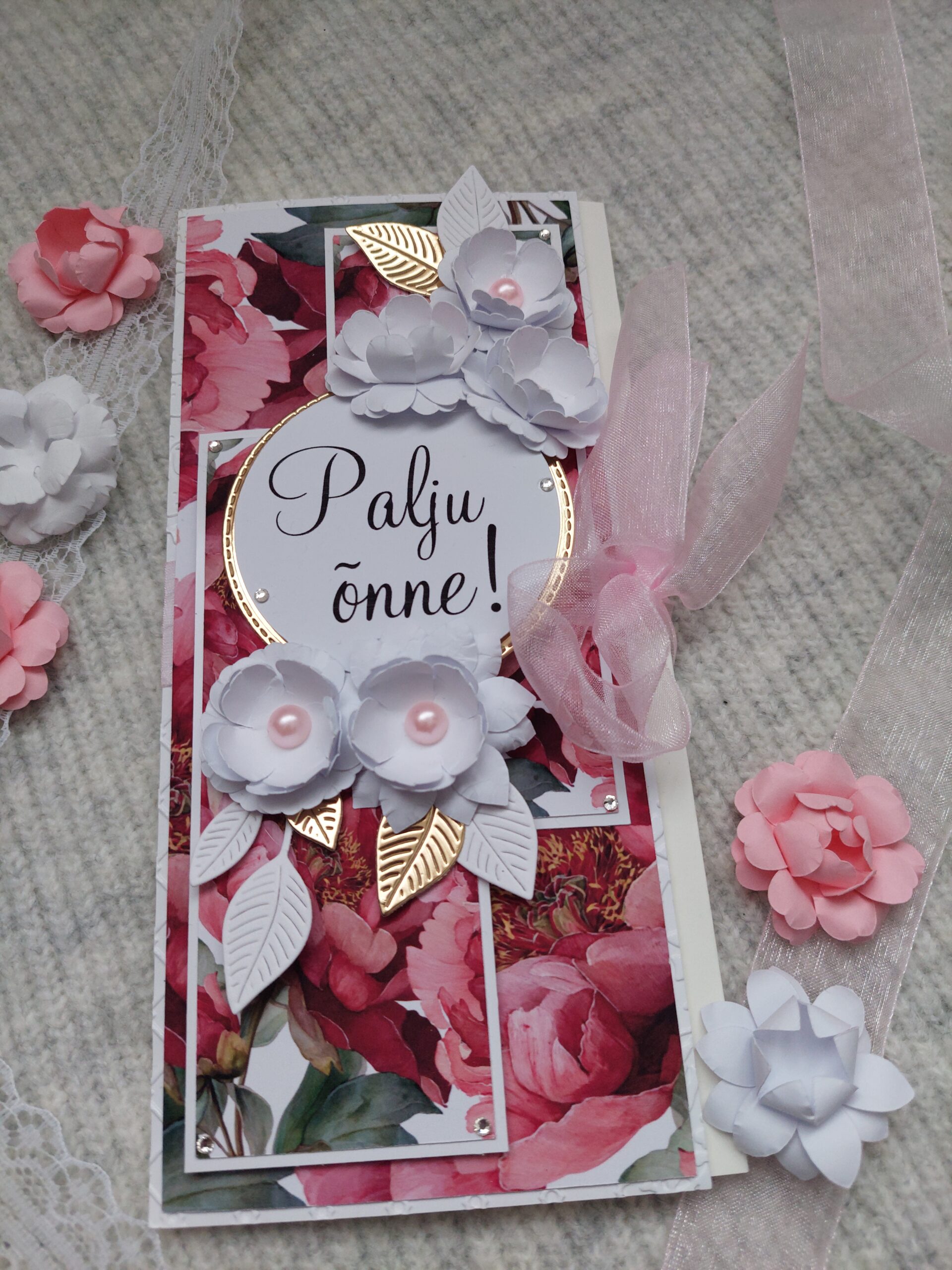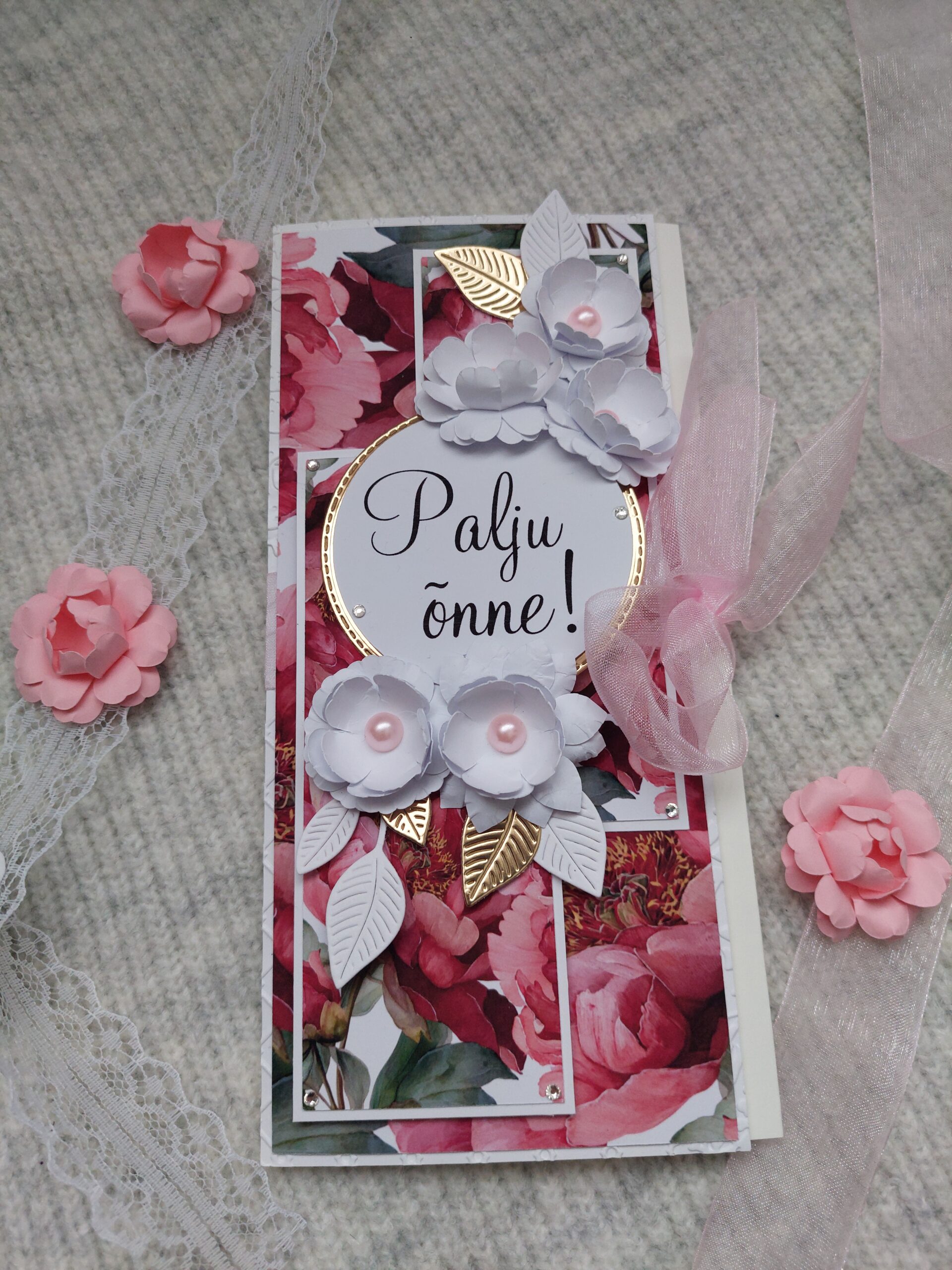Pildil olev kaart on valmistatud hoole, armastuse ja tähelepanuga, kasutades kauneid omavahel sobivaid detaile.